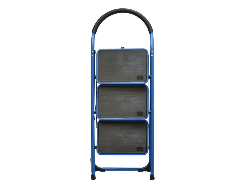 Skládací kovový žebřík se třemi příčkami je praktickým nástrojem pro různé práce ve výškách. Žebřík má modrou barvu a černé prvky, které mu dodávají elegantní vzhled. Každá příčka je pokryta černým, nerovným povrchem, který zajišťuje pohodlí a jistotu při chůzi.