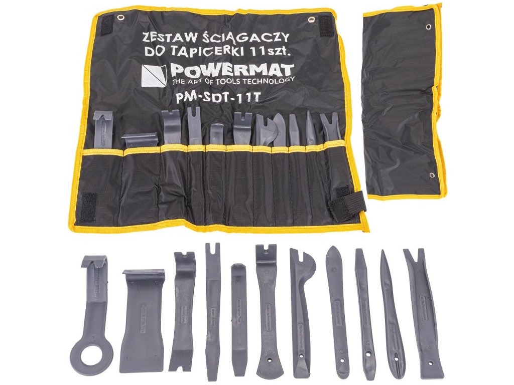 Sada demontážních nástrojů POWERMAT PM-SDT-11T obsahuje 11 plastových nástrojů určených pro bezpečnou demontáž čalounění, interiérových lišt, panelů a plastových klipů bez poškození povrchu. Nástroje jsou vyrobeny z odolného technického plastu a umožňují snadné páčení i v hůře přístupných místech.