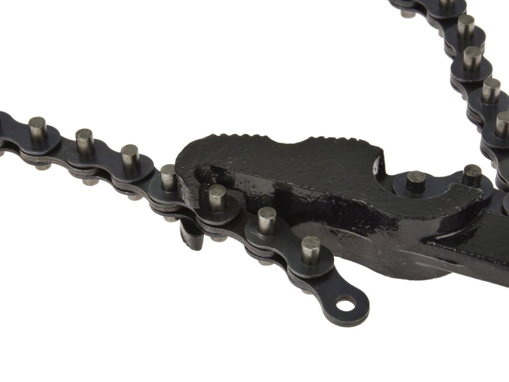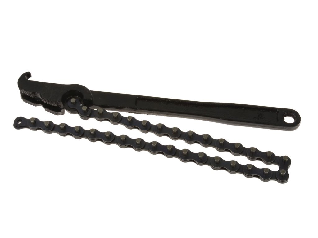 Řetězový klíč na olejové filtry, vybavený robustním řetězem o délce 52 cm, umožňujícím obsluhu filtrů o průměru do 150 mm.