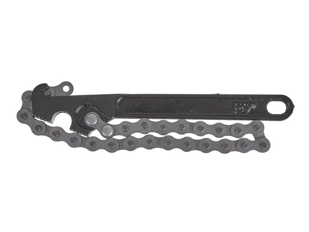 Řetězový klíč na olejové filtry, vybavený robustním řetězem o délce 41 cm, umožňujícím obsluhu filtrů o průměru až 125 mm.