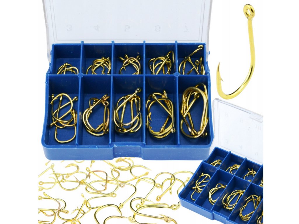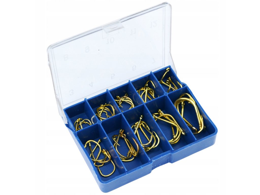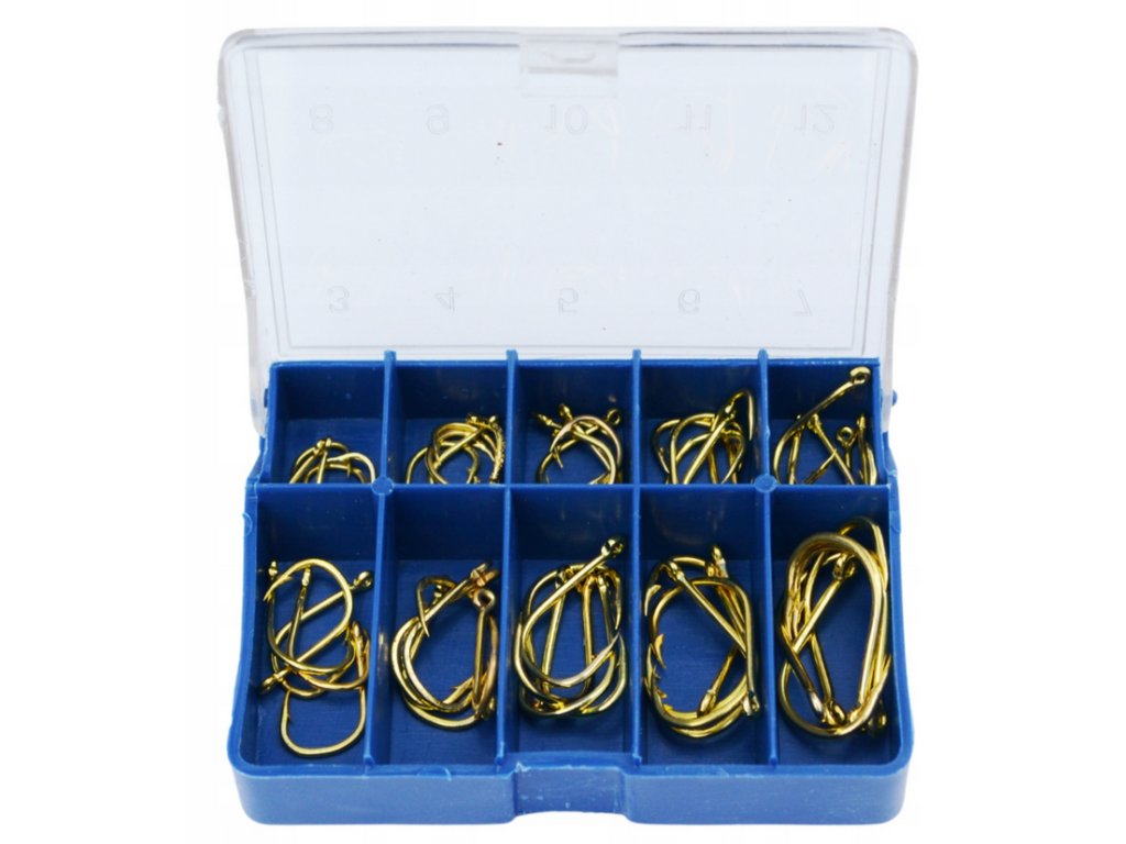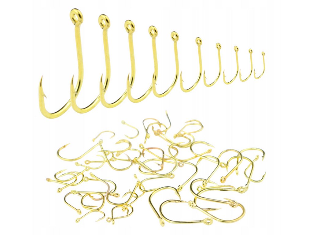 Sada 50 rybářských háčků – 10 velikostí, zlaté, s očkem, v praktické krabičce