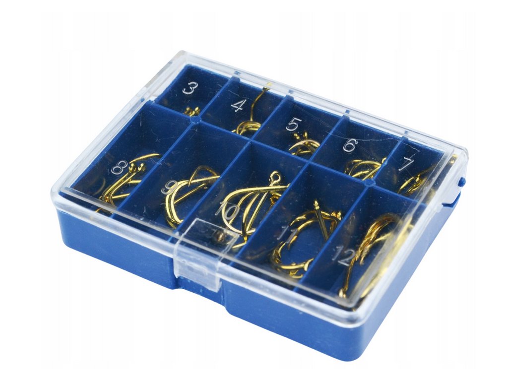 Kompletní sada 50 kvalitních rybářských háčků se zlatým povrchem a očkem, po 5 kusech v každé z 10 velikostí (3–12). Ideální pro různé techniky lovu – feeder, plavaná, položená. Vše uloženo v praktickém přenosném boxu.