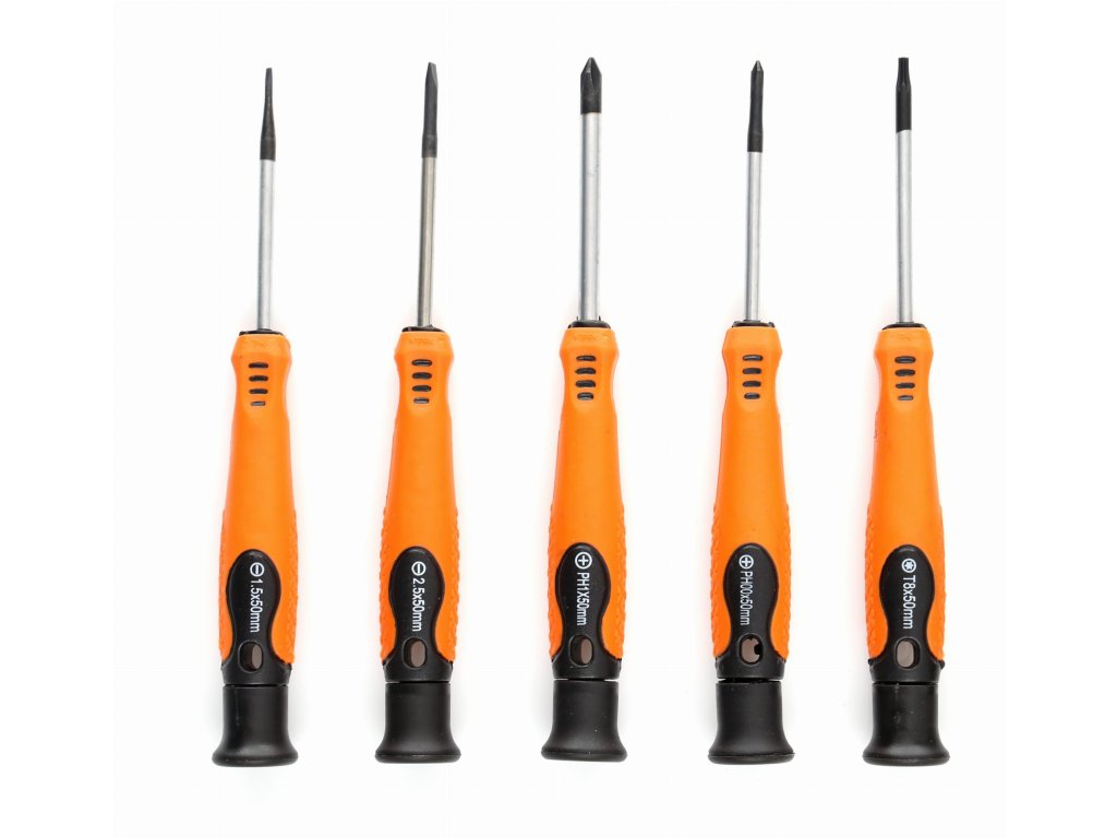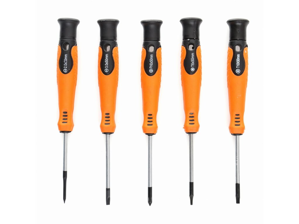 - Tradiční šroubováky zahrnují 4 ploché (1.5x50, 2.0x50, 2.5x50, 3.0x50mm) a 3 křížové (PH00x50, PH0x50, PH1x50).
