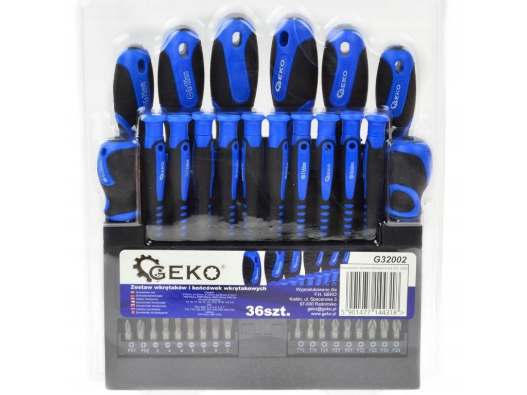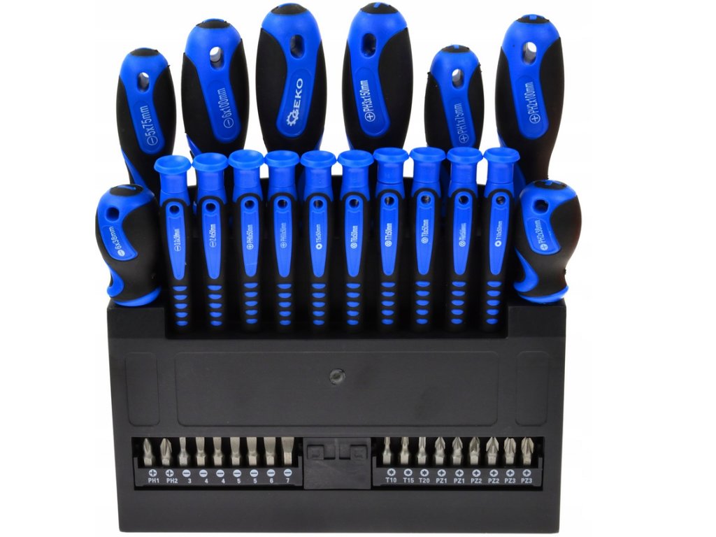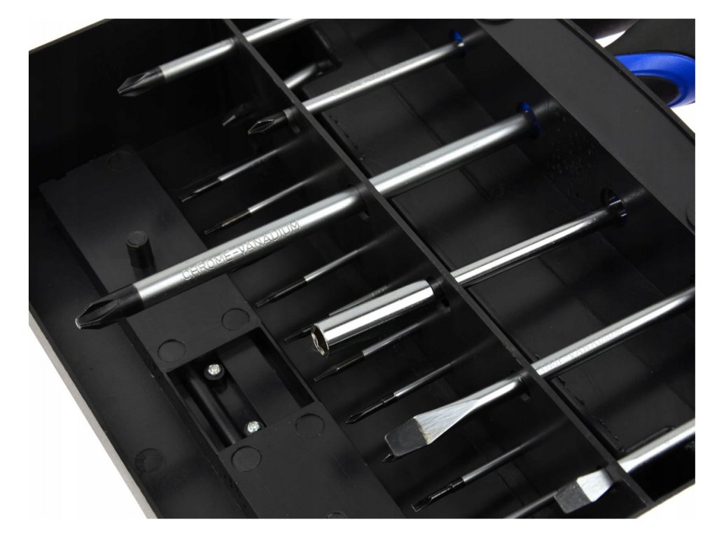 Sada obsahuje tři typy šroubováků (PH křížový, plochý, přesný Torx) a 4 druhy bitů (PH křížový, PZ křížový, plochý, přesný Torx) v různých velikostech.