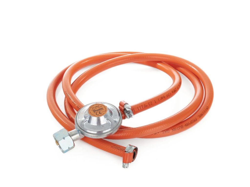 Jednostupňový reduktor nízkotlakého plynu s plynovým potrubím o délce 2 m. Reduktor pro propan s tlakem 37 mbar. Použití: pro láhve s nominálním obsahem plynu do 11 kg.