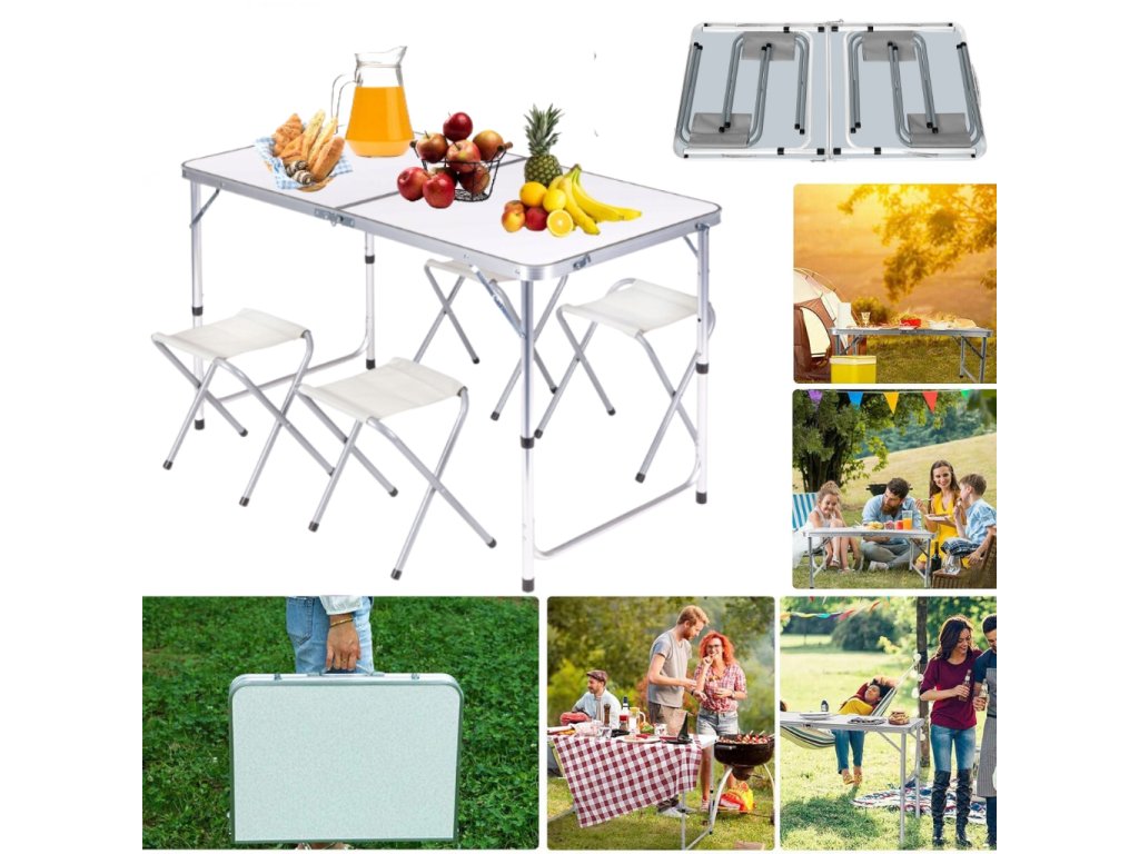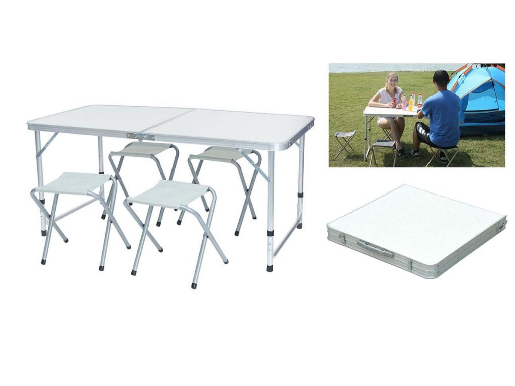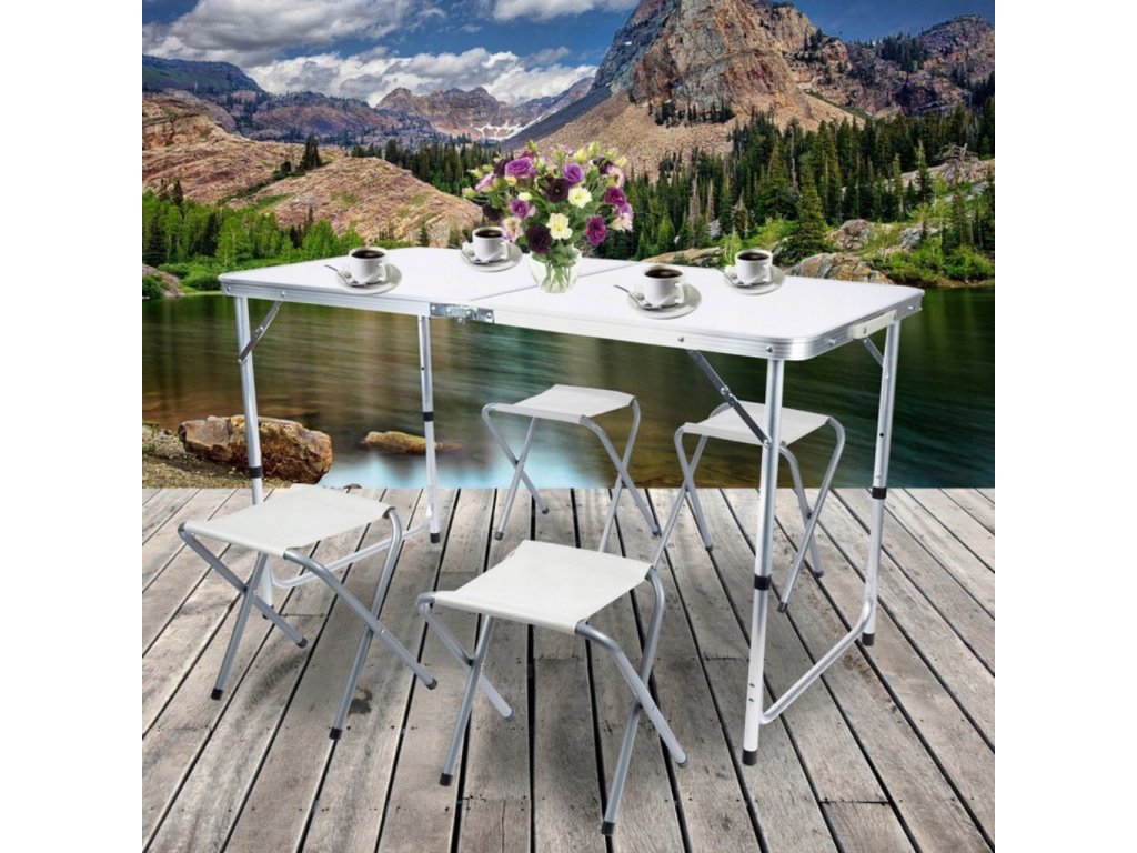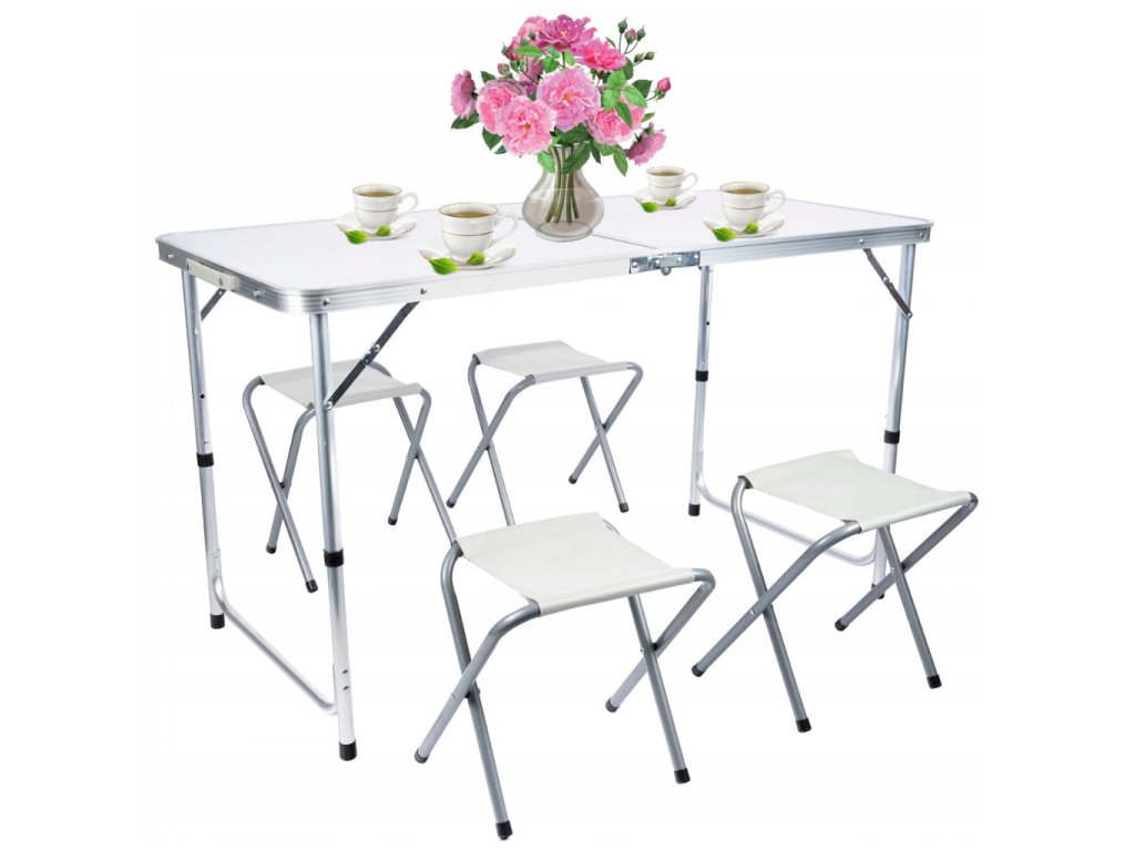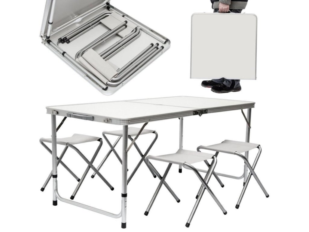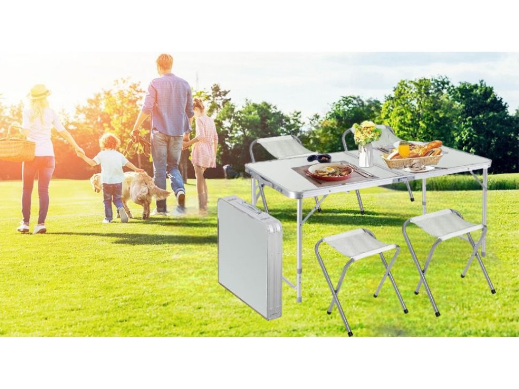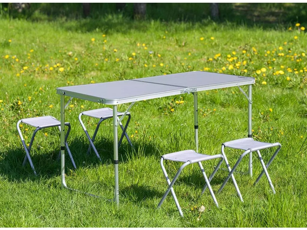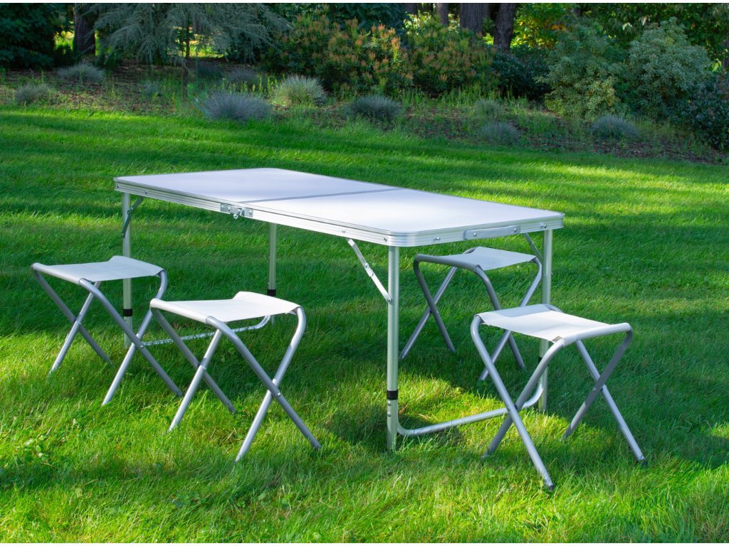 - Turistický set – skládací stůl + 4 židle – praktický cestovní nábytek v kufříku: lehký hliníkový rám, rychlé skládání a pohodlné sezení pro rodinu či přátele kdekoliv v přírodě