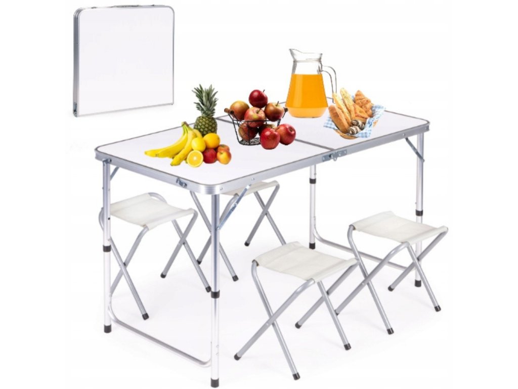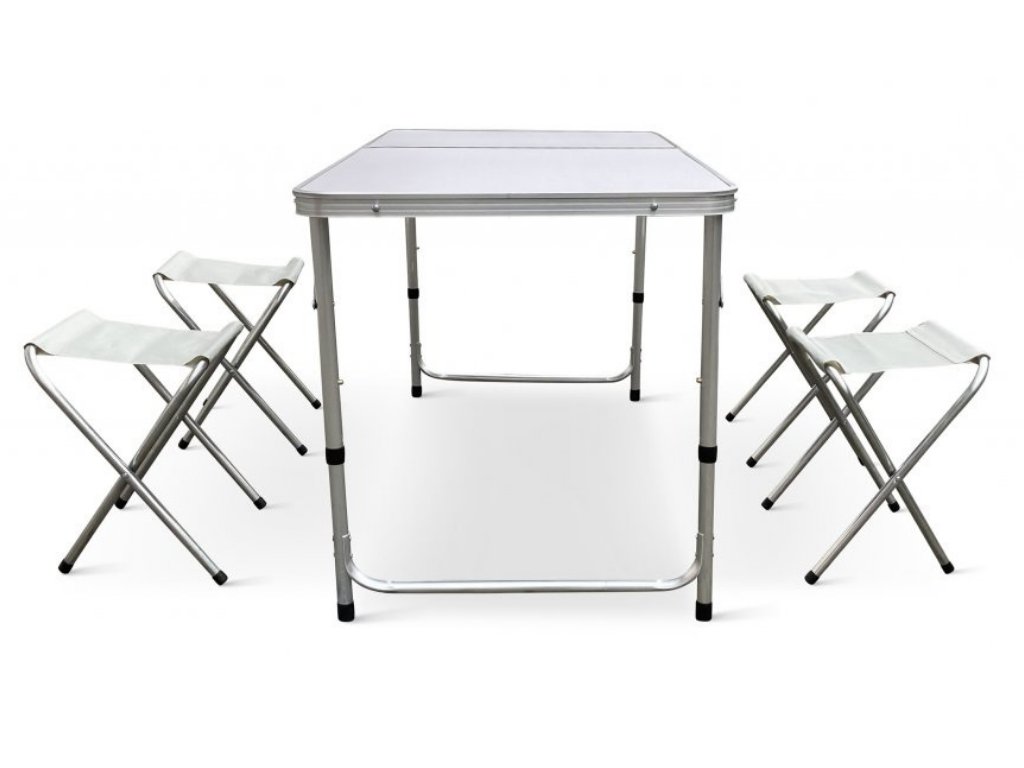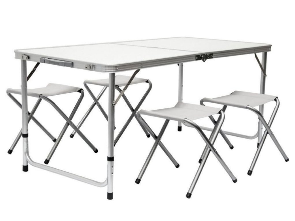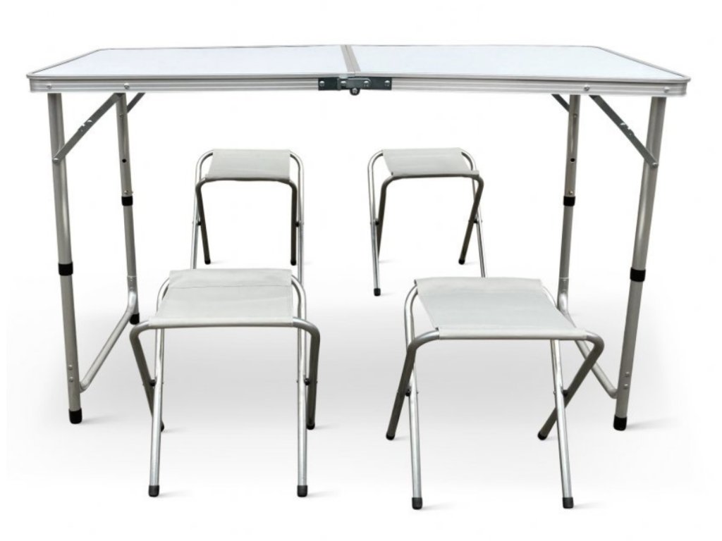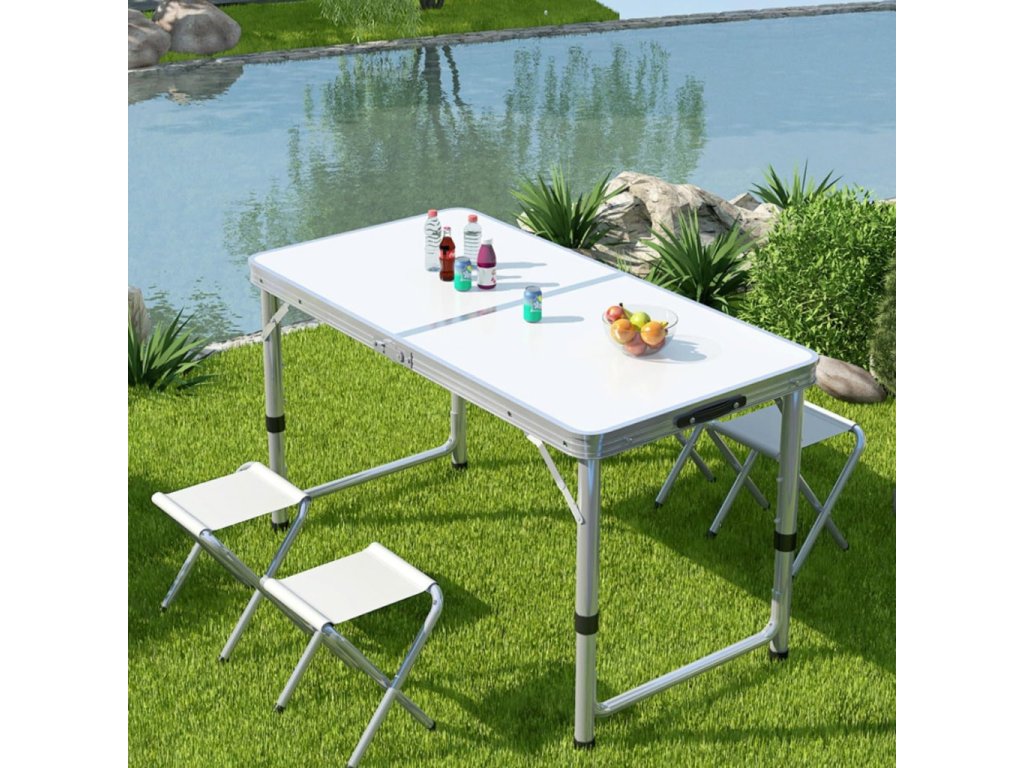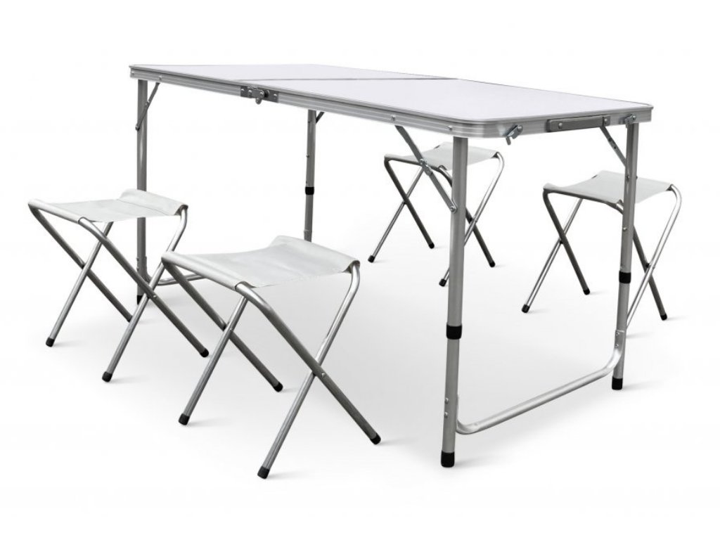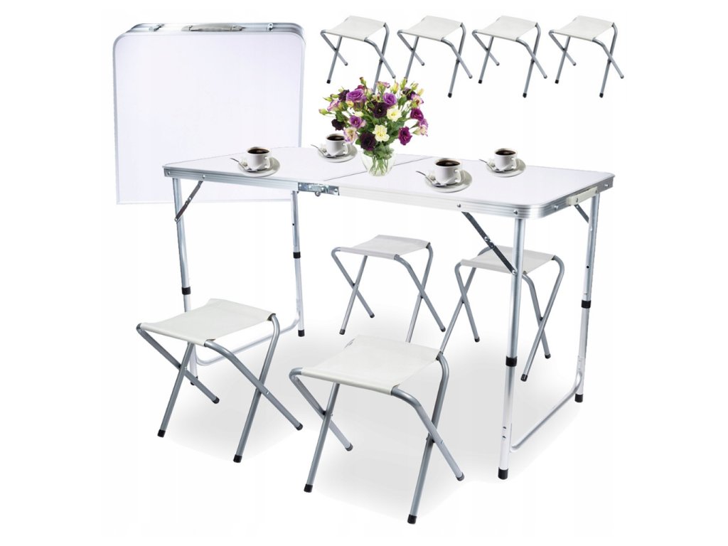 - Turistický set – skládací stůl + 4 židle – praktický cestovní nábytek v kufříku: lehký hliníkový rám, rychlé skládání a pohodlné sezení pro rodinu či přátele kdekoliv v přírodě
