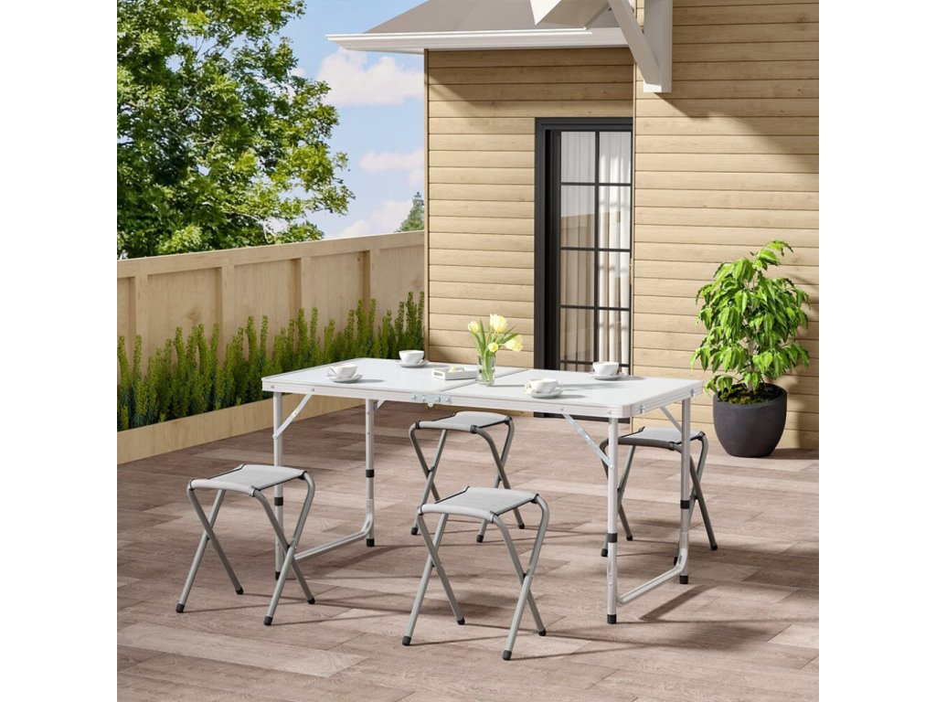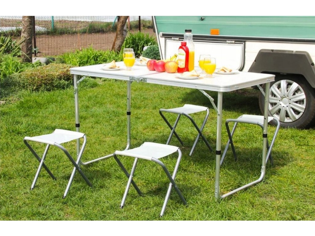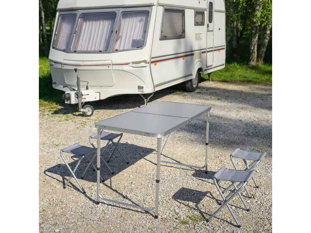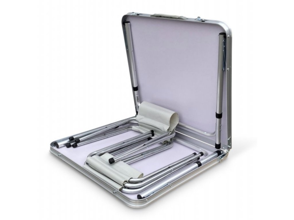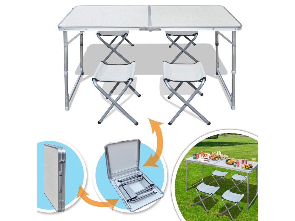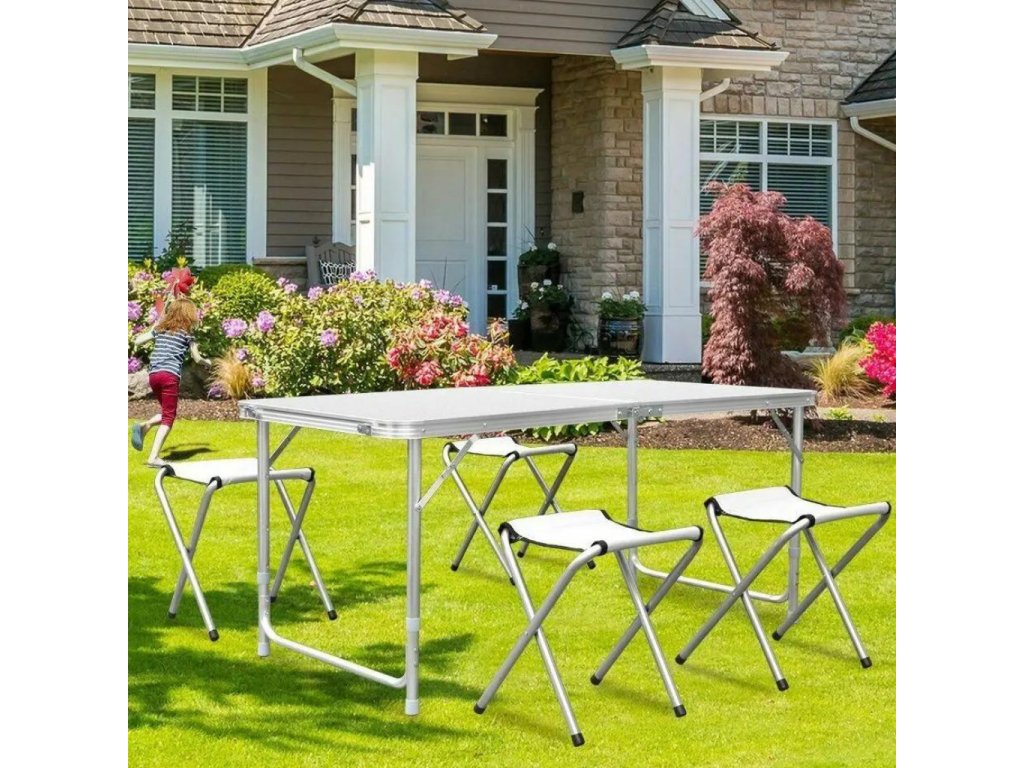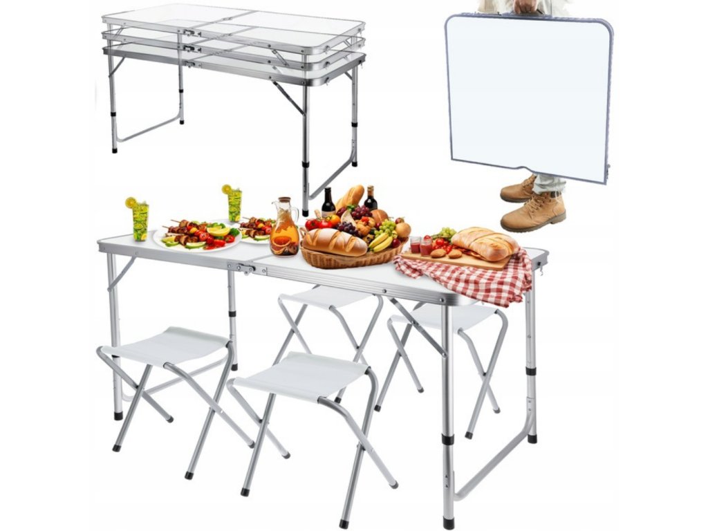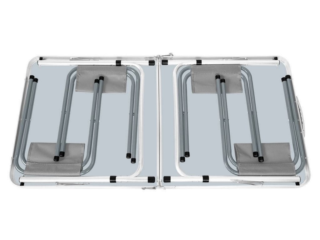 - Turistický set – skládací stůl + 4 židle – praktický cestovní nábytek v kufříku: lehký hliníkový rám, rychlé skládání a pohodlné sezení pro rodinu či přátele kdekoliv v přírodě