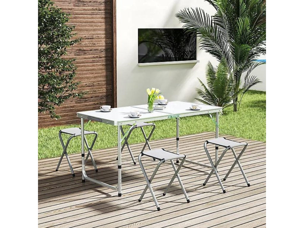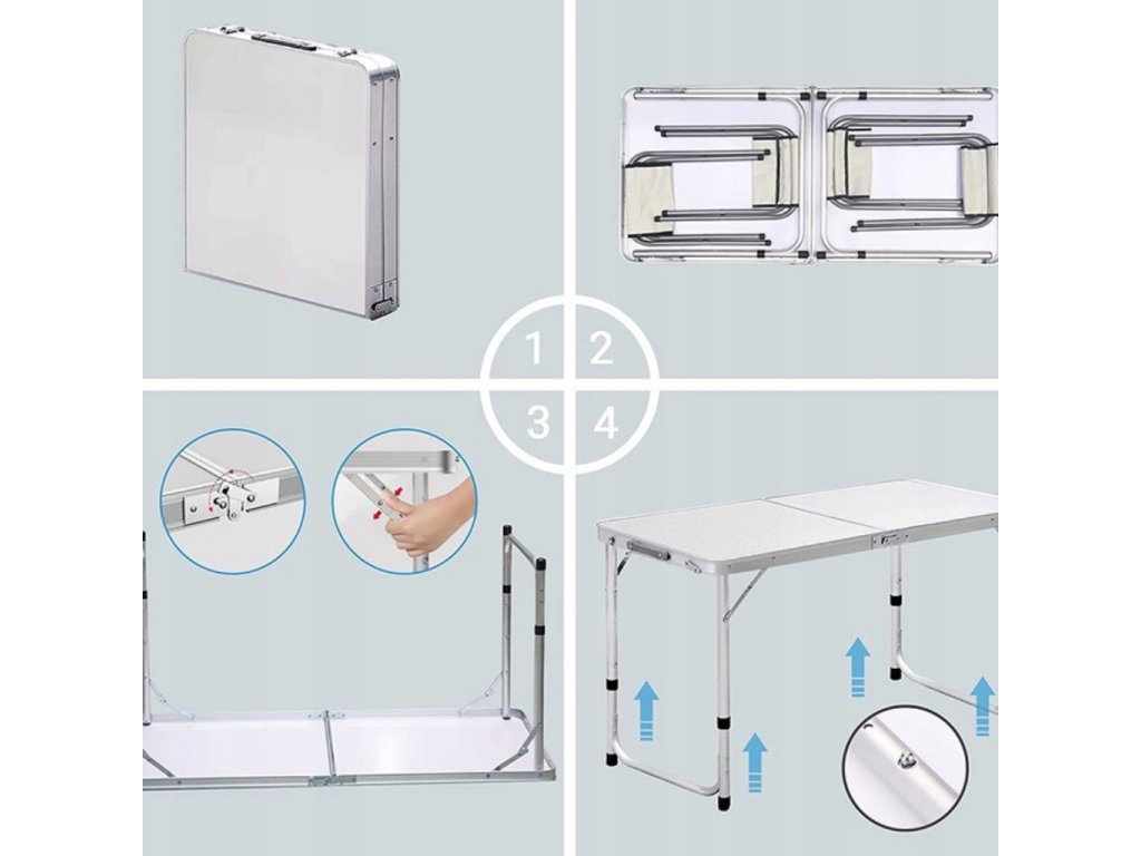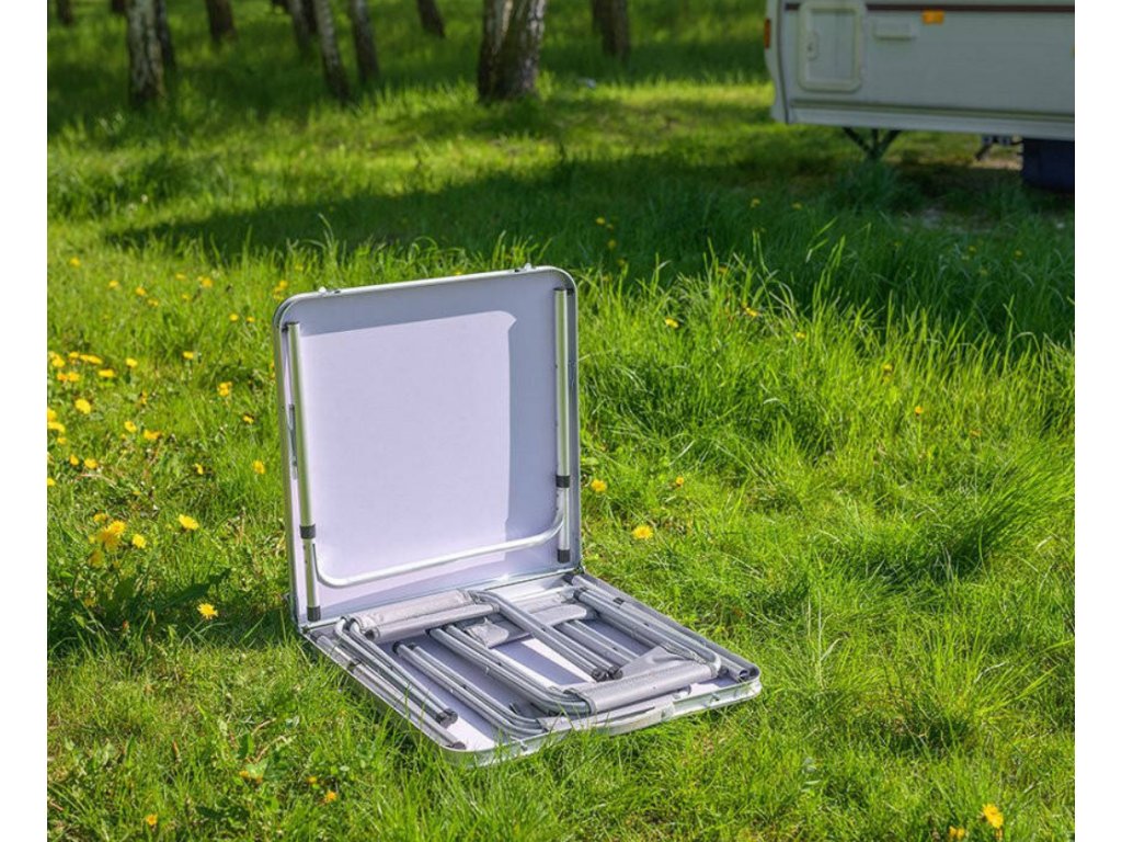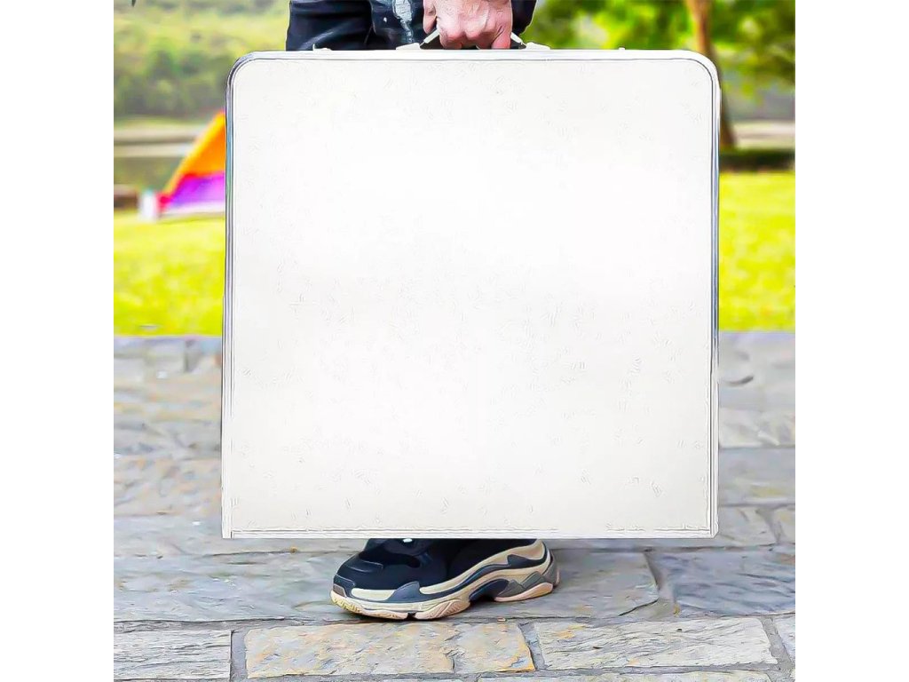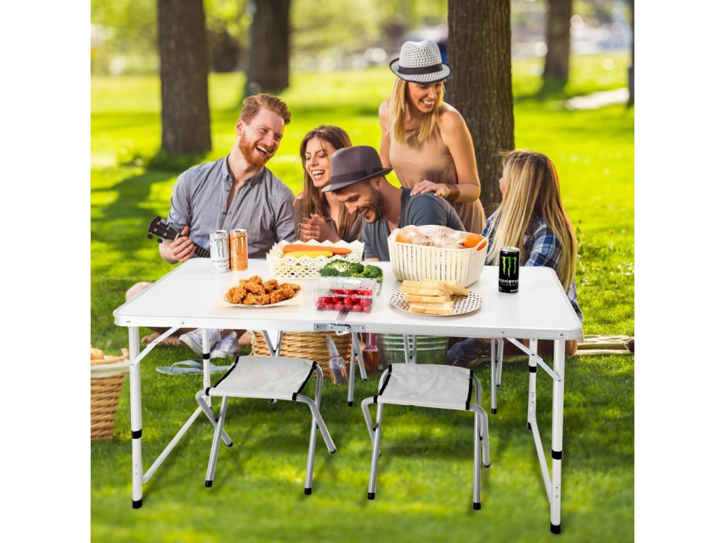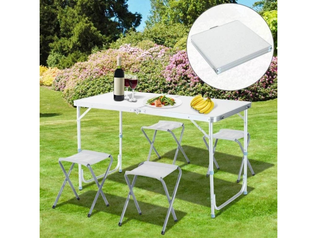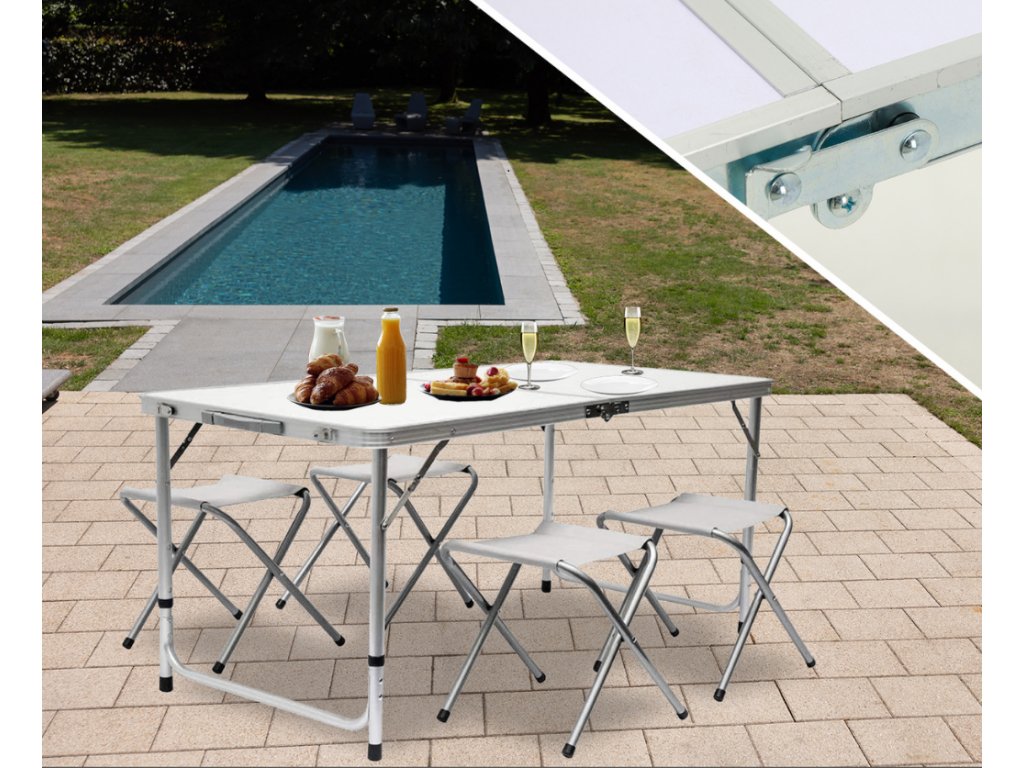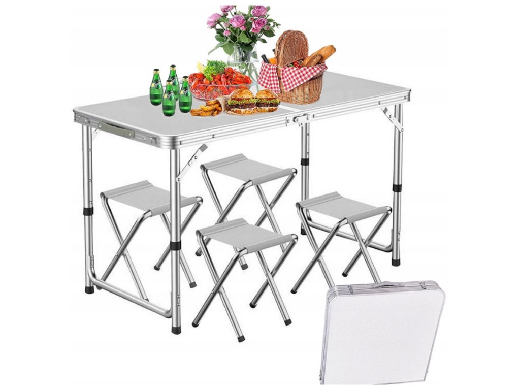 - Turistický set – skládací stůl + 4 židle – praktický cestovní nábytek v kufříku: lehký hliníkový rám, rychlé skládání a pohodlné sezení pro rodinu či přátele kdekoliv v přírodě
