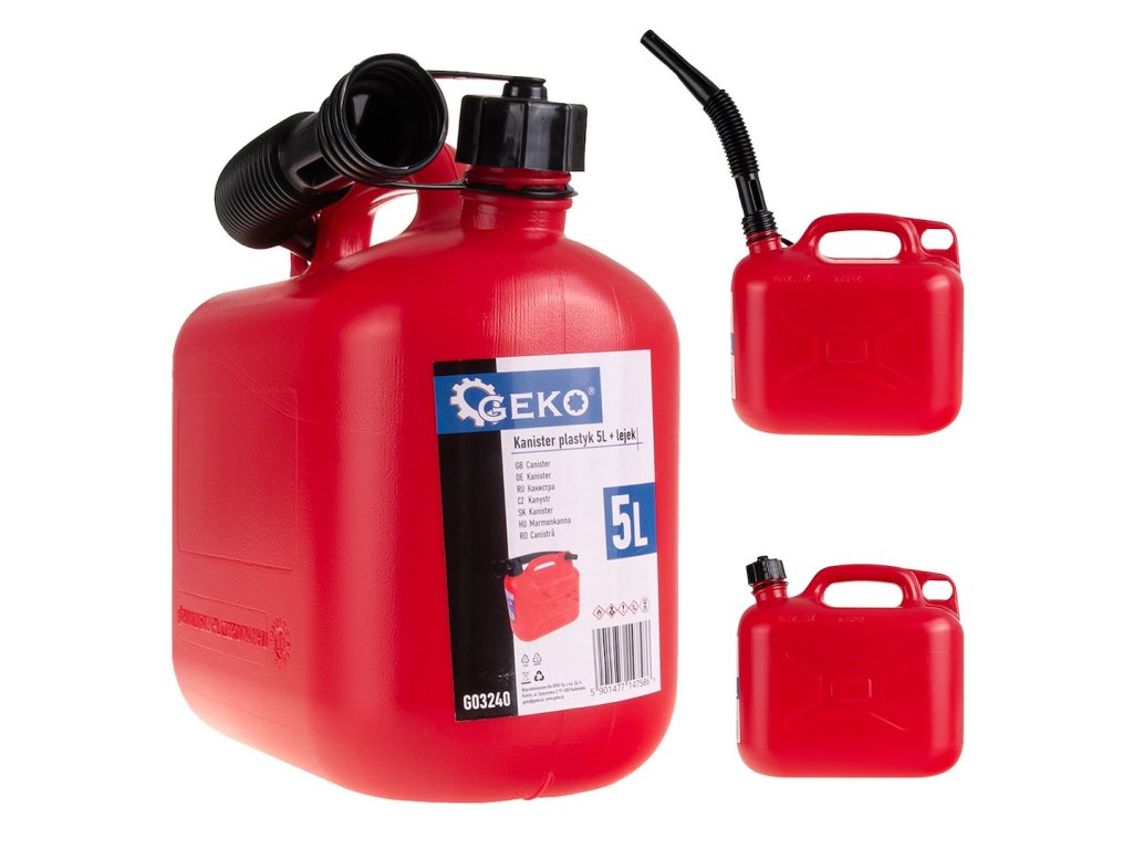 Plastový kanystr o objemu 5 litrů. Má držadlo pro přenášení a k nádobě přišroubovaný výtokový trychtýř. Určený pro palivo, oleje a vodu. Kanystr splňuje normy (certifikát) 3H1/Y/150/18/PL COBRO 1558/HGB.
